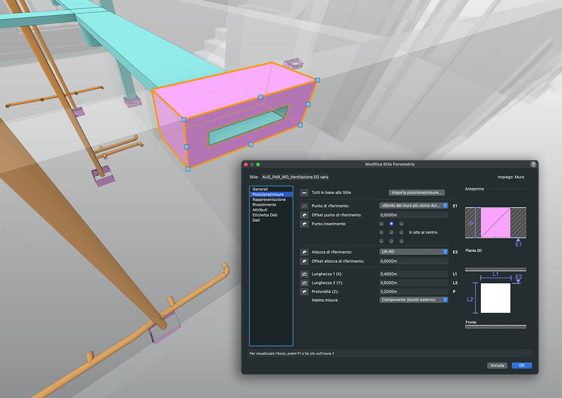 Con il nuovo strumento Forometria, un’esclusiva della versione italiana di Vectorworks, è possibile inserire fori bidimensionali e tridimensionali, come aperture, fori centrali o fessure, in oggetti di tipo Muro o Solaio. Le forometrie sono oggetti parametrici che possono essere modificati utilizzando la Tavolozza Informazioni. Questa funzione è disponibile solo nella versione in italiano.