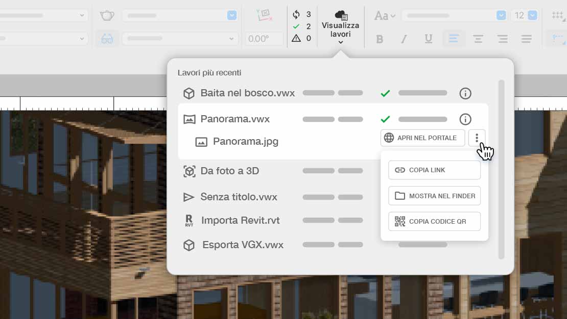 Ottieni tutti i vantaggi dei Vectorworks Cloud Services senza mai uscire dall’applicazione desktop principale. Il nuovo widget Stato Cloud nella Barra delle Viste di Vectorworks fornisce aggiornamenti in tempo reale sull’elaborazione Cloud, sullo stato di avanzamento dei lavori e l’accesso diretto ai risultati. Elimina il continuo passaggio da un’app all’altra, così puoi rimanere concentrato, sincronizzato e produttivo.